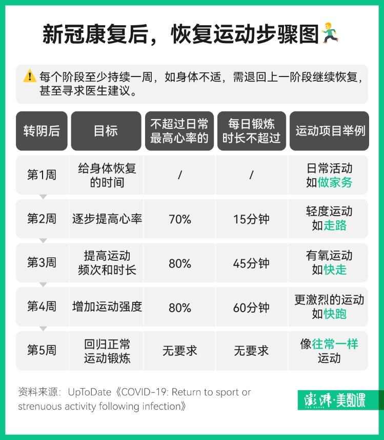 然后再花 7 天時間結(jié)合低強(qiáng)度運(yùn)動,比如去散散步。在身體無任何不適的情況下,在下一周再將運(yùn)動強(qiáng)度提高一個檔次。等轉(zhuǎn)陰一個月后,期間無任何不適后,再考慮將運(yùn)動強(qiáng)度恢復(fù)到感染前的強(qiáng)度。