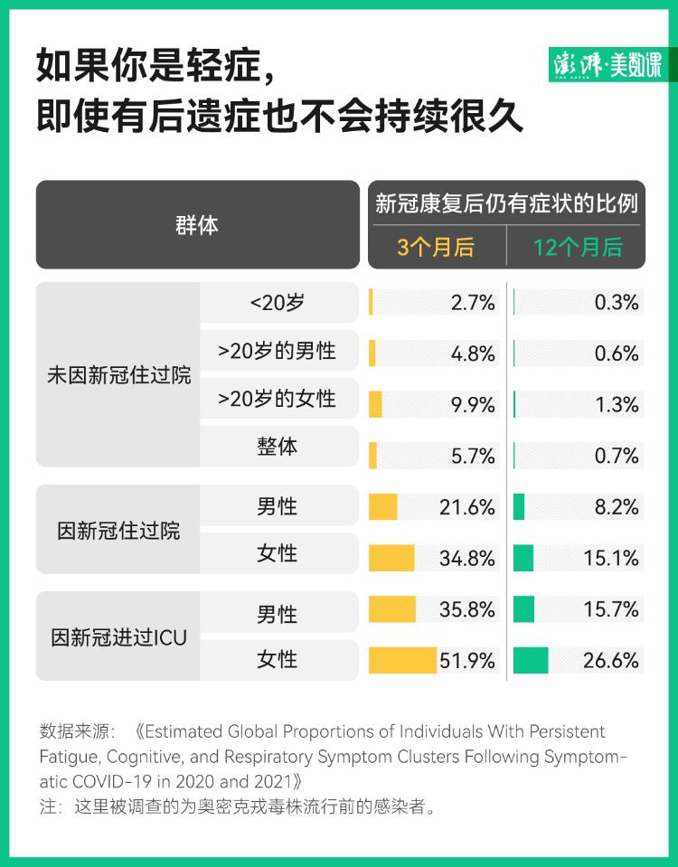 2022 年 10 月,世界衛(wèi)生組織牽頭完成了目前全球最大規(guī)模的新冠后遺癥研究,通過對 120 萬新冠確診患者長達(dá)一年多的追蹤調(diào)查后發(fā)現(xiàn),新冠后遺癥的消失速度,其實(shí)比早先預(yù)計(jì)的要樂觀得多:在得新冠 12 個月后,仍受長新冠影響的非住院患者僅為 0.7%,而在得新冠 3 個月時,有 5.7% 的人受此影響。
