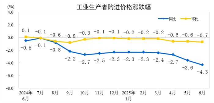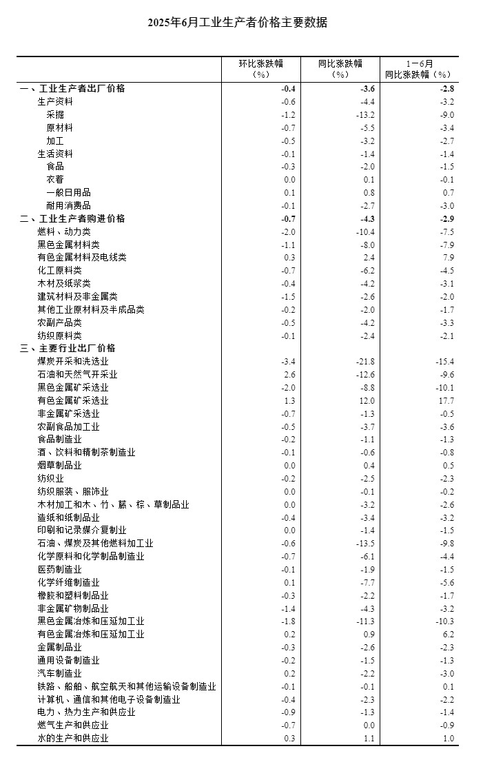 2025年6月份,全國(guó)工業(yè)生產(chǎn)者出廠價(jià)格同比下降3.6%,環(huán)比下降0.4%;工業(yè)生產(chǎn)者購(gòu)進(jìn)價(jià)格同比下降4.3%,環(huán)比下降0.7%。上半年,工業(yè)生產(chǎn)者出廠價(jià)格比上年同期下降2.8%,工業(yè)生產(chǎn)者購(gòu)進(jìn)價(jià)格下降2.9%。