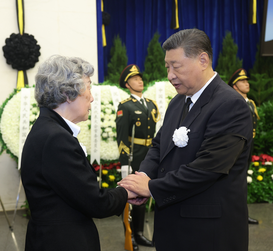 10月14日,吳邦國同志遺體在北京八寶山革命公墓火化。習近平、趙樂際、王滬寧、蔡奇、丁薛祥、李希、韓正等前往八寶山送別,胡錦濤送花圈表示哀悼。這是習近平與吳邦國親屬握手,表示深切慰問。