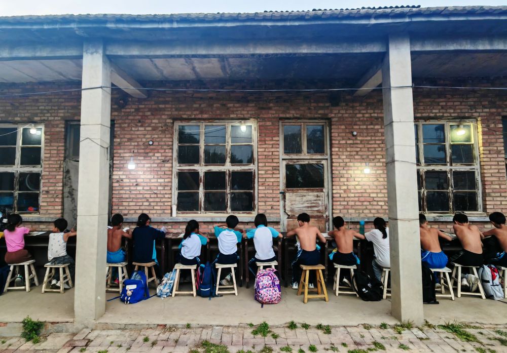 5月7日,摔跤訓(xùn)練前孩子們在寫作業(yè)。新華社記者 楊帆 攝