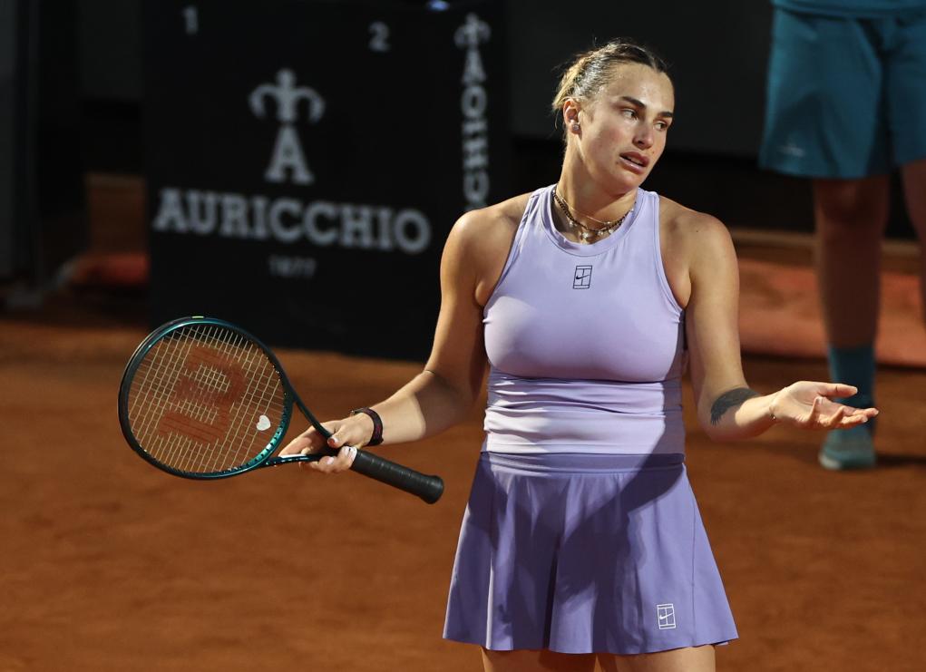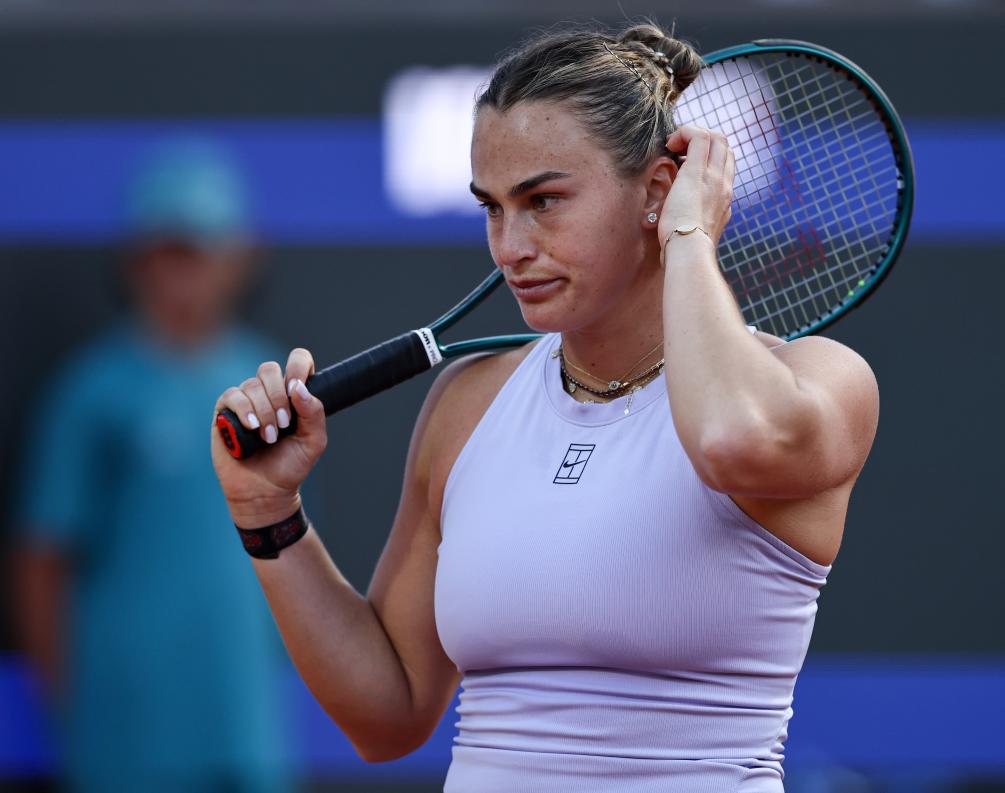 5月14日,薩巴倫卡在比賽中發(fā)球。