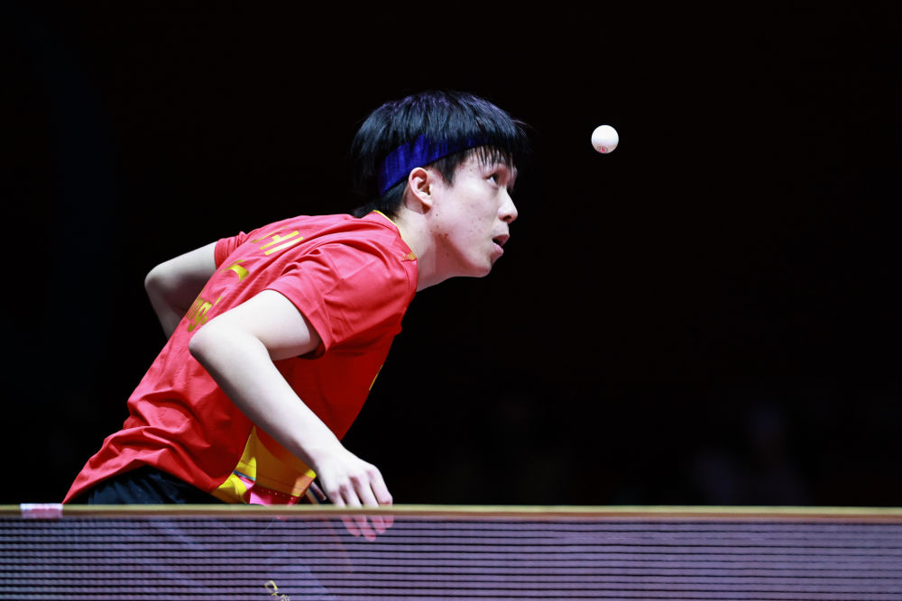 5月17日,王楚欽在比賽中回球。(新華社記者 劉續(xù) 攝)