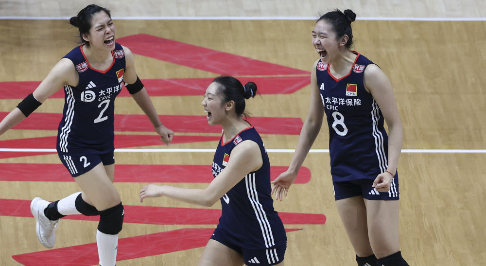 6月5日,中國(guó)隊(duì)球員莊宇珊、唐欣、萬(wàn)梓玥(從左至右)在比賽中慶祝得分。新華社記者 韓巖 攝