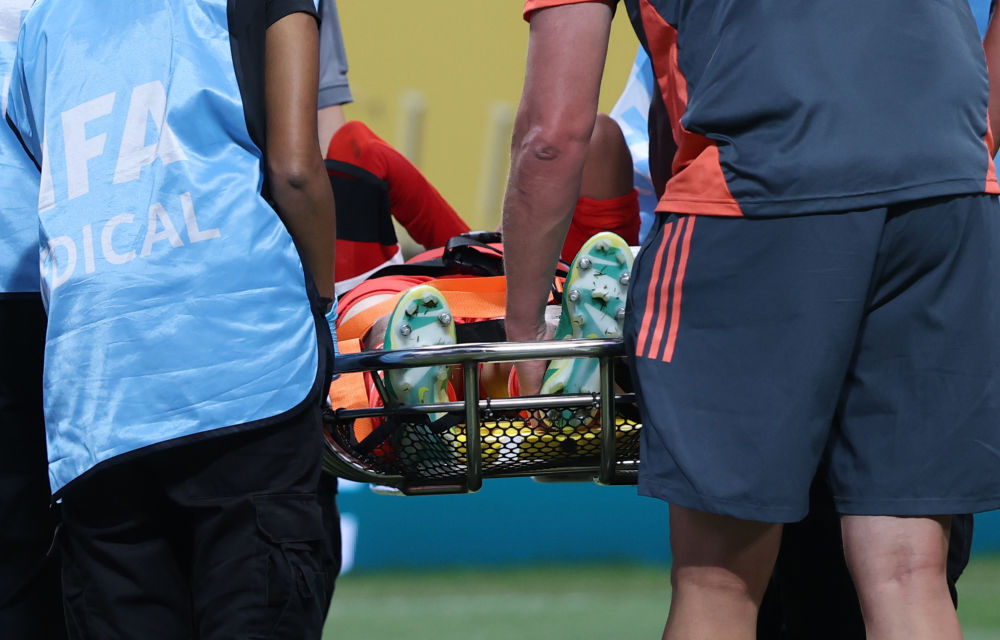 7月5日,拜仁慕尼黑隊(duì)醫(yī)護(hù)人員用手扶住穆西亞拉受傷的腳踝。新華社記者 李明 攝