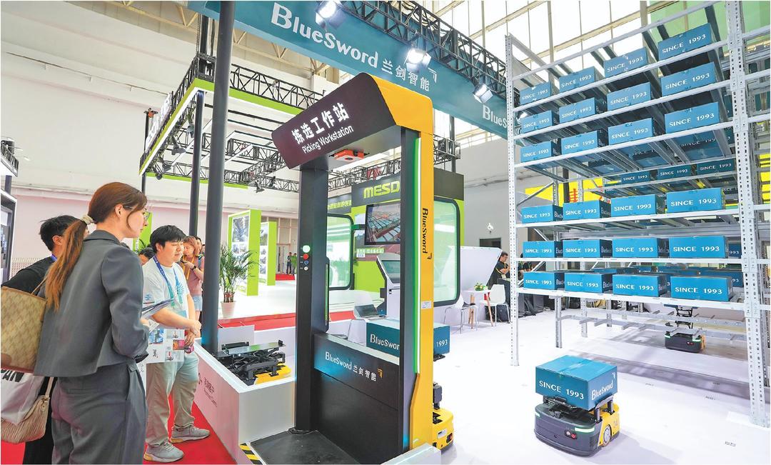 新華社發(fā) 7月16日,參觀者在先進(jìn)制造鏈展區(qū)蘭劍智能展臺了解“蜘蛛俠懸掛式料箱機(jī)器人系統(tǒng)”。