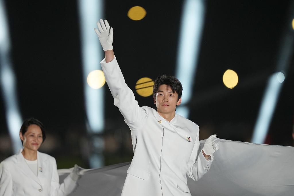 8月7日,國際奧林匹克委員會會旗執(zhí)旗手汪順(右)在第12屆世界運動會開幕式上。新華社記者 劉坤 攝