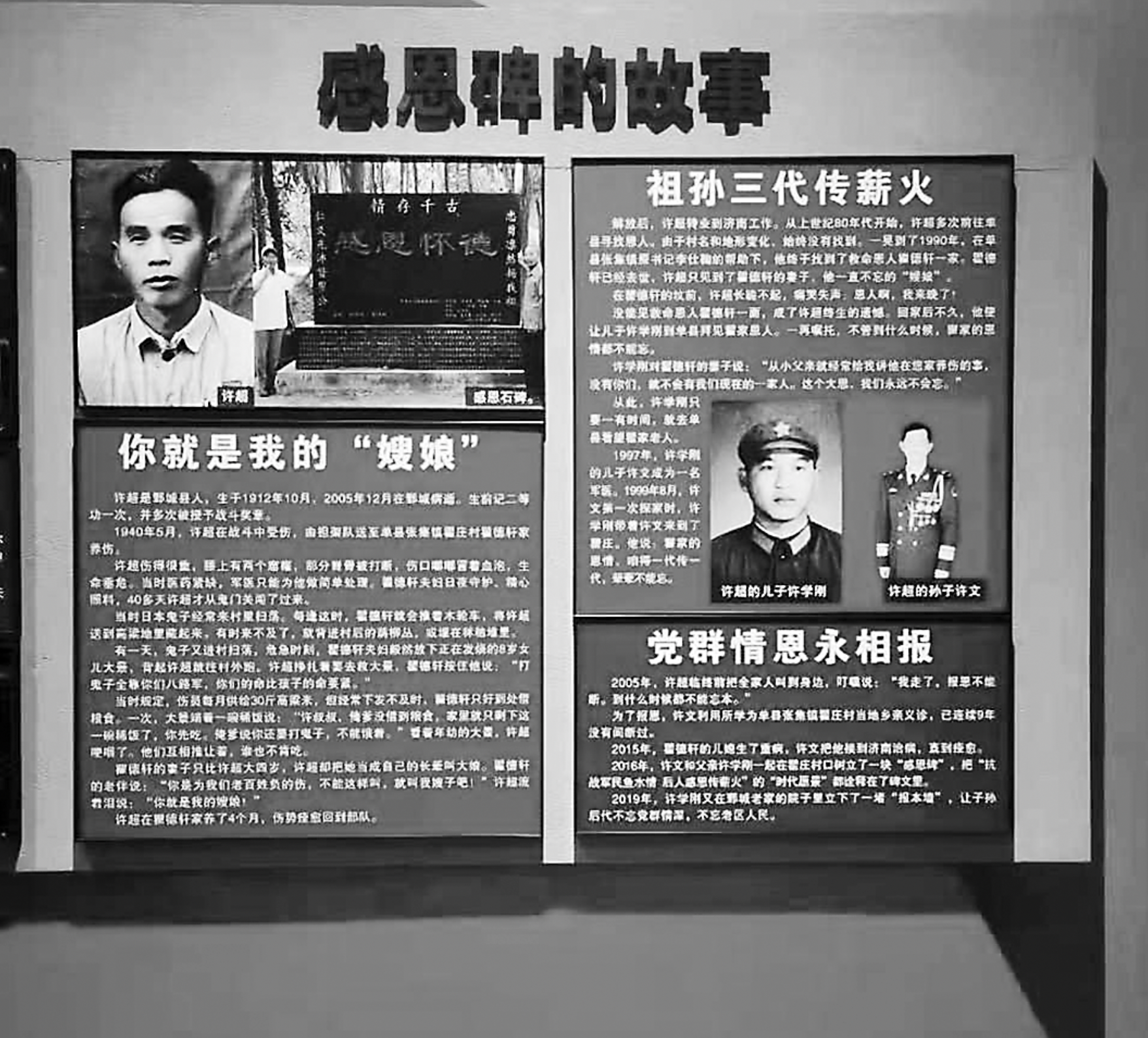 單縣張集鎮(zhèn)通往瞿莊村的路口,立著一座醒目的石碑,碑的正面是四個(gè)大字“感恩懷德”,背面記載了許超和瞿德軒之間延續(xù)80多年生死與共、血肉相連的感人故事,鐫刻著“黨恩民情兩不忘 世世代代永相親”的不變初心——