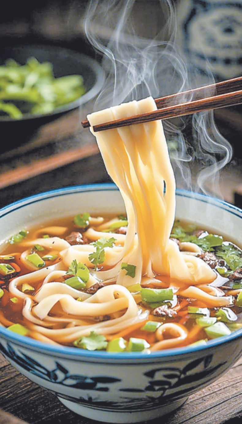 老板娘系著藍白格子圍裙從灶臺后探出身,鬢角的碎發(fā)沾著面粉,笑起來眉眼彎彎,像春日里剛?cè)诨南鳌O聠魏蟛贿^片刻,一碗熱氣騰騰的面條便落在桌上。細白的面條臥在琥珀色的湯里,幾縷蔥絲浮在表面,看似尋常,可當筷子觸碰到面條的瞬間,我便察覺到了異樣——不同于機器壓制面條的光滑規(guī)整,這些面條帶著自然的紋理,入口時彈牙的觸感層層遞進,仿佛每一根都藏著故事。
