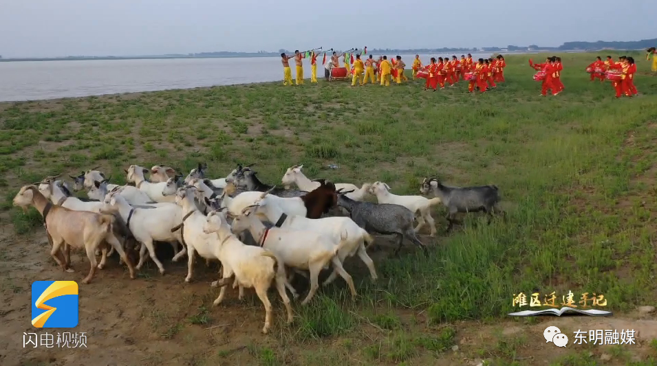 “起鼓開河啦!”隨著王友生的一聲吆喝,王菜園村的鑼鼓隊(duì)在黃河邊齊聲演奏了起來。只見他們四人一組,時(shí)而后撤各自敲擊,時(shí)而聚集斗鼓震天,還伴有聲聲長(zhǎng)號(hào),像極了群羊啼叫。這就是黃河邊的非物質(zhì)文化遺產(chǎn)——羊抵頭鼓舞。
