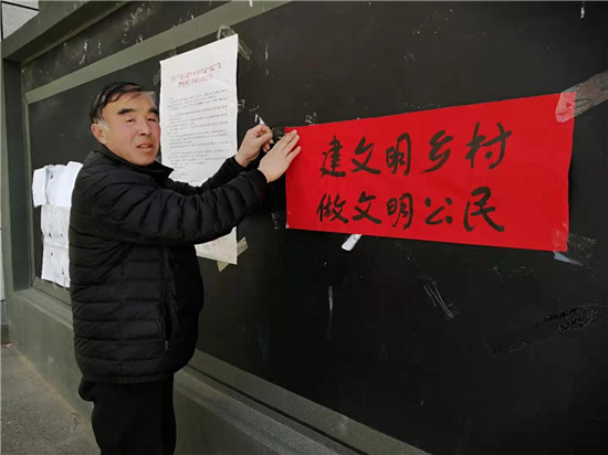 3月15日,在牡丹區(qū)安興鎮(zhèn)江莊行政村,劉錫建正在張貼宣傳標(biāo)語,向村民宣傳文明鄉(xiāng)村建設(shè)工作。