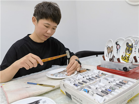 至今,一把把堅(jiān)硬的工筆刀在韋月香柔弱的指間旋轉(zhuǎn)了20年,一只只各色各樣的瓷盤記載著其青春芳華的無(wú)聲夢(mèng)想。斗轉(zhuǎn)星移、凝眸守望之間,韋月香全身心地徜徉在只有自己才能“陶醉”的叮叮當(dāng)當(dāng)?shù)男鷩淌澜缋铮核诖杀P上以墨書寫、繪畫,接著持刀刻劃、鑿鐫,鉆刀法、雙勾法、刮刀法運(yùn)用自如,瓷盤表面便形成大小、疏密、深淺不同的“點(diǎn)”的排序,最終構(gòu)成了所需要的畫面或字體,再將雙線間的瓷釉刮去填色……“刻瓷風(fēng)格質(zhì)樸典雅,既能體現(xiàn)傳統(tǒng)書畫藝術(shù)特色,又能保持瓷器表面的晶瑩光潔,形成獨(dú)特的藝術(shù)效果?!表f月香手語(yǔ)。