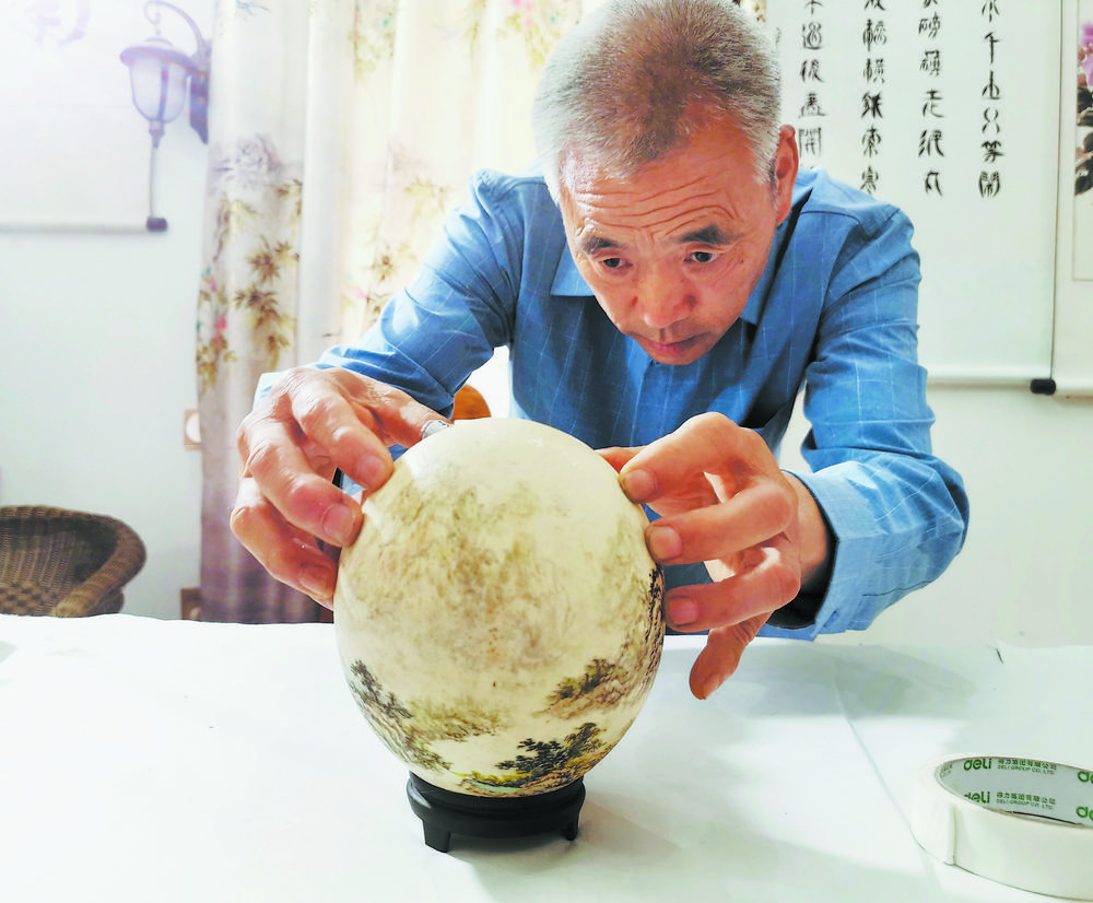 怎么把蛋黃蛋清取出來,又不破壞蛋殼?侯乃聚嘗試了不少方法。后來,他琢磨出一套“電鉆法”。他把蛋殼洗凈,用電鉆在下面開一個小口,用針管把蛋黃和蛋清吸出來,反復操作后,灌入消毒液清洗蛋殼內(nèi)壁,晾干后,再用砂紙打磨蛋殼,用極細的畫筆在蛋殼上勾勒打底、上色……一個個生動多彩的蛋殼畫在侯乃聚的手下誕生了。