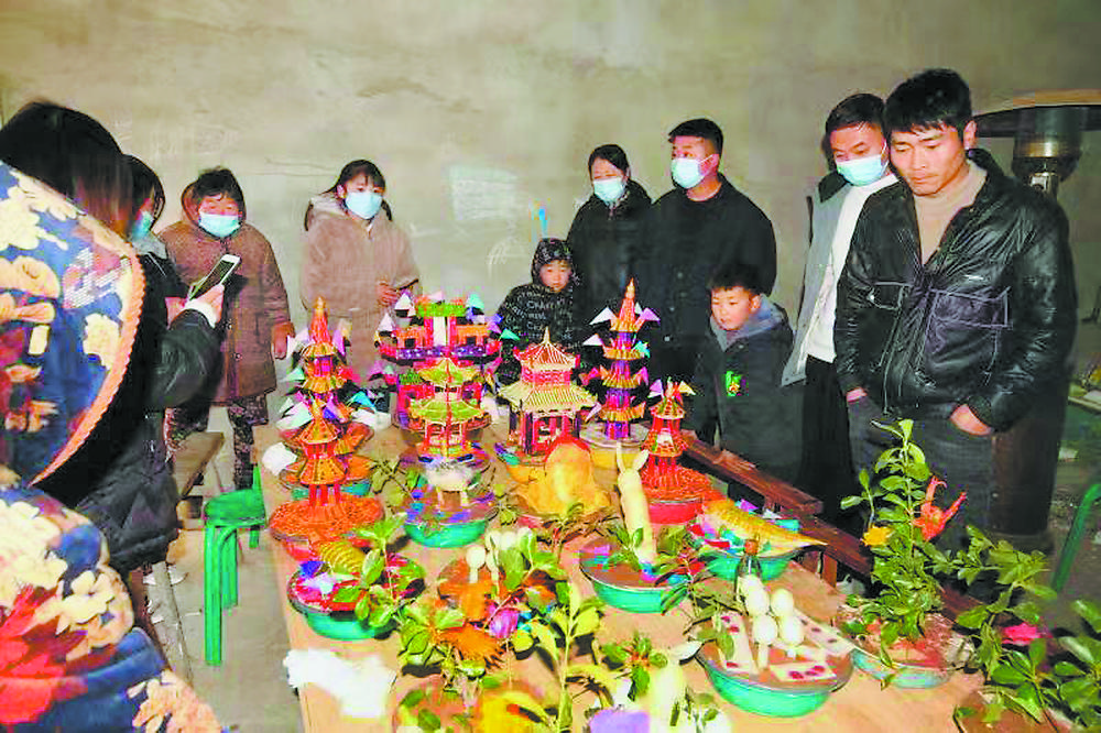 花供的傳統(tǒng)塑法有多種,有生面塑、熟面塑,膠泥捏制而成的,并施以彩繪;也有用蘿卜、水果等其他材料制作的。栩栩如生的十二生肖、壽星、龍鳳等吉祥物,都是農(nóng)戶手工制作而成。莊寨鎮(zhèn)南街村村民任憲德告訴記者:“2023年是兔年,我特意用面粉做了兩只兔子,寓意兔年吉祥、大吉大利?!?/p>