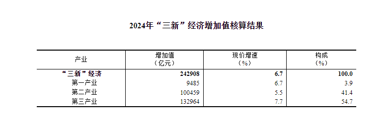 經(jīng)核算,2024年我國“三新”經(jīng)濟增加值為242908億元,比上年增長6.7%(按現(xiàn)價計算),比同期國內(nèi)生產(chǎn)總值(GDP)現(xiàn)價增速高2.5個百分點;占GDP的比重為18.01%,比上年提高0.43個百分點[1]。