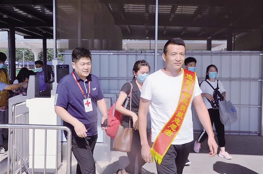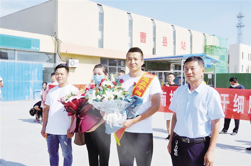 8月26日下午3時,趙傳利在濟南成功捐獻造血干細胞后平安返回曹縣,在火車站受到了戰(zhàn)友和同學(xué)的熱烈歡迎。隨后,趙傳利所在的青菏街道專門為他舉行了歡迎儀式。