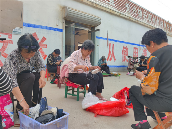 5月18日下午,牡丹晚報全媒體記者來到牡丹區(qū)安興鎮(zhèn),在云履千層底手工布鞋鞋業(yè)廠房外,一幕兒時常見的畫面出現(xiàn)在眼前:幾名農(nóng)村婦女圍坐在陰涼處,歡聲笑語不斷傳出;說話間,手中的活計并未停止,只見她們一手緊握鞋底,一手捏著針線,隨著一扎一頂一拽,針線鞋底上下翻飛。