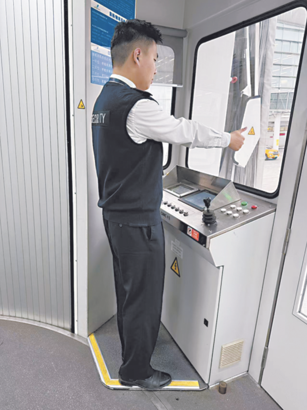 “廊橋前面有滑動模塊。我們操縱廊橋時,模塊高度在兩米七左右,空中客車(客機型號)高一些,達(dá)三米三左右。操作時的精確度方面,要求保護裝置與艙門的高度差在10至20厘米,最后實現(xiàn)完全對接?!崩詈暧钫f。