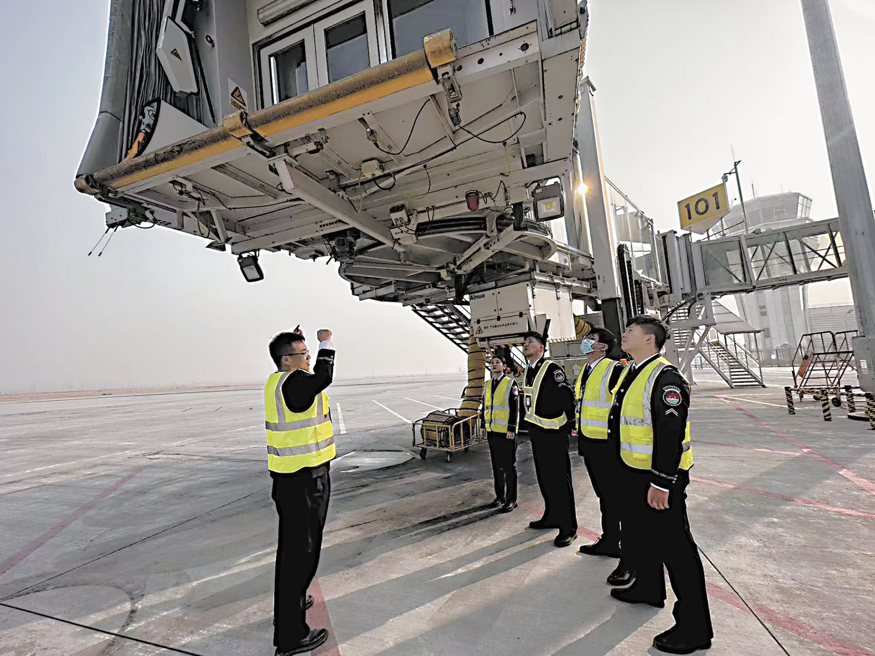 在發(fā)動機的轟鳴聲中,廊橋工作員的工作節(jié)奏與航班時刻表緊緊“捆綁”在一起。不僅要保障廊橋的對接操作,還需要時刻做好設(shè)備的維護和細(xì)致的安全檢查,哪怕是一顆松動的螺絲、一處細(xì)微的電路故障都不能“放過”。