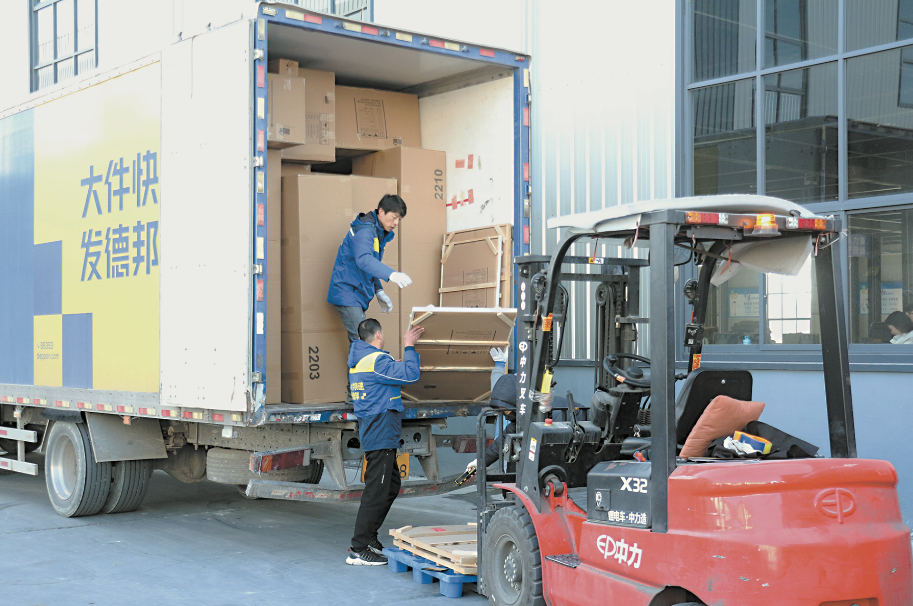 12月8日,在位于曹縣古營集鎮(zhèn)的菏澤金啟電子科技有限公司,一輛輛運輸原材料、成品的車輛川流不息,車間流水線上是機械和工人共同演奏的全力生產(chǎn)交響曲,穿行在廠區(qū)的叉車尤其繁忙,不斷將產(chǎn)品運往在車間外等待已久的貨車上,貨運司機隨時待命發(fā)車。