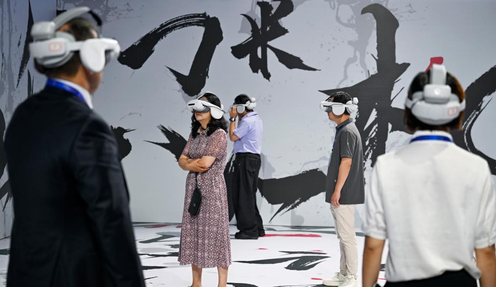 7月4日,重慶市永川國際會展中心,嘉賓在現(xiàn)場體驗中國電影科技企業(yè)的虛擬影片。(陳誠 攝)
