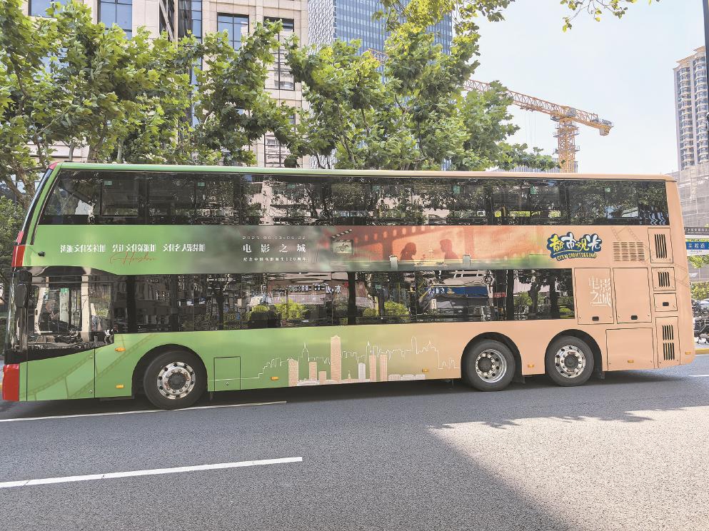 “跟著《醬園弄》去旅行”定制巴士外觀設(shè)計(jì)精心,車(chē)身以復(fù)古黃綠配色打底,側(cè)面海報(bào)復(fù)刻了電影里“醬園”墻的經(jīng)典場(chǎng)景,“電影之城”等字樣格外醒目。“這就是‘行走的電影彩蛋’嘛!”汪女士興奮地拉起閨蜜的手,與雙層巴士合影。9點(diǎn)30分發(fā)車(chē),這輛巴士變身成移動(dòng)的“城市光影會(huì)客廳”,從上海大廈、外白渡橋,到禮查飯店舊址,途經(jīng)白玉蘭廣場(chǎng)(觀影點(diǎn))、勝利電影院(乍浦路醬園弄主題街區(qū))、今潮8弄等眾多文化地標(biāo),為游客帶來(lái)了不一般的微旅行體驗(yàn)。