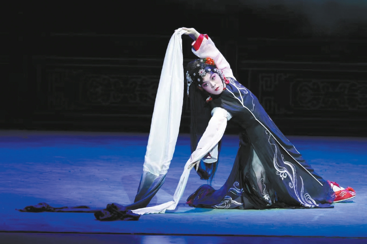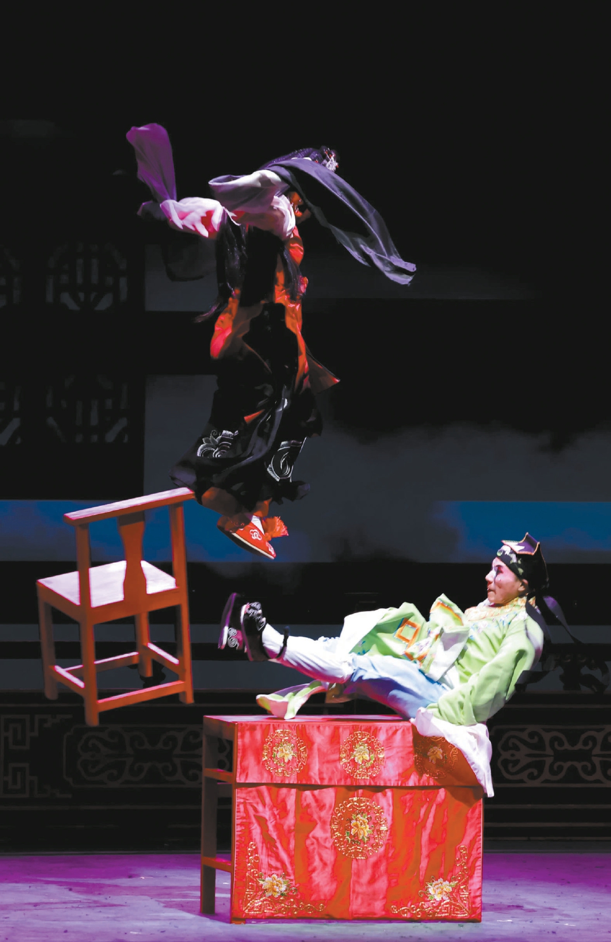 該劇技巧自然是上難度又有特色,且難得都是用傳統(tǒng)道具而技巧出新:一是旦角立于兩腿翹起的椅子的橫棖上,丑角拖著椅子原地旋轉(zhuǎn),兩人配合做出各種身段;一是“桌上踹凳”,椅立桌上,丑角從下長(zhǎng)門起跑橫踹,旦角凌空跳起,椅子落地,旦角穩(wěn)穩(wěn)落于桌面。不過更值得一說的是,“活捉”中閻惜嬌這一角色,情癡又決絕,各劇種前輩演員對(duì)其情緒的開發(fā)已臻“像素級(jí)”。而鮑陳熱的閻惜嬌通過水袖的開合、蘭花指的運(yùn)用,給閻惜嬌帶上了一種貓科動(dòng)物的軀體特征,讓她的時(shí)而嫵媚時(shí)而狠厲也有了別樣的風(fēng)情。讓人物比技巧更有記憶點(diǎn),真是不易,也讓人對(duì)她將在國(guó)家大劇院為北京觀眾帶來的演出充滿了期待。