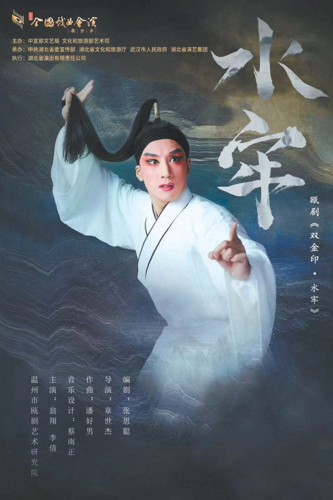 如果說臺(tái)州亂彈這一折的創(chuàng)新尚在戲曲的“規(guī)矩”之內(nèi),甌劇的創(chuàng)新就有些“出格”了?!峨p金印·水牢》一折中有大量表現(xiàn)劇中人物在水里行走、站立艱難的身段,并不是完全來源于戲曲,像是從現(xiàn)代舞中有所借鑒。更有甚者,表現(xiàn)貼墻潛行的段落,使出了霹靂舞的經(jīng)典動(dòng)作“擦玻璃”。這場(chǎng)演下來現(xiàn)場(chǎng)觀眾彩聲不斷,觀演氣氛極好,但我個(gè)人總覺得演員還有點(diǎn)兒“食而不化”,大量借鑒來的身段對(duì)生活場(chǎng)景的模擬過于具體,與他穿插其中的抽象戲曲程式并不能很好地融合,審美也因此顯得割裂。