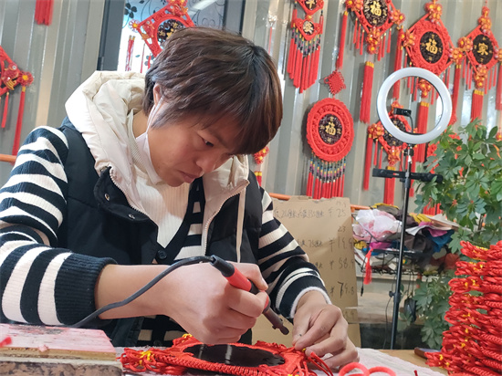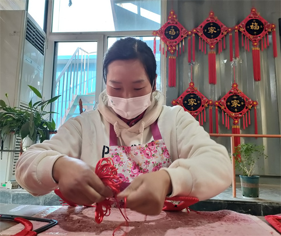 一根普通的紅繩,經(jīng)過村民巧手編織,再與盤錦、玫瑰花、桃木板等配飾組裝在一起,就變成了精美又喜慶的中國結(jié)。
