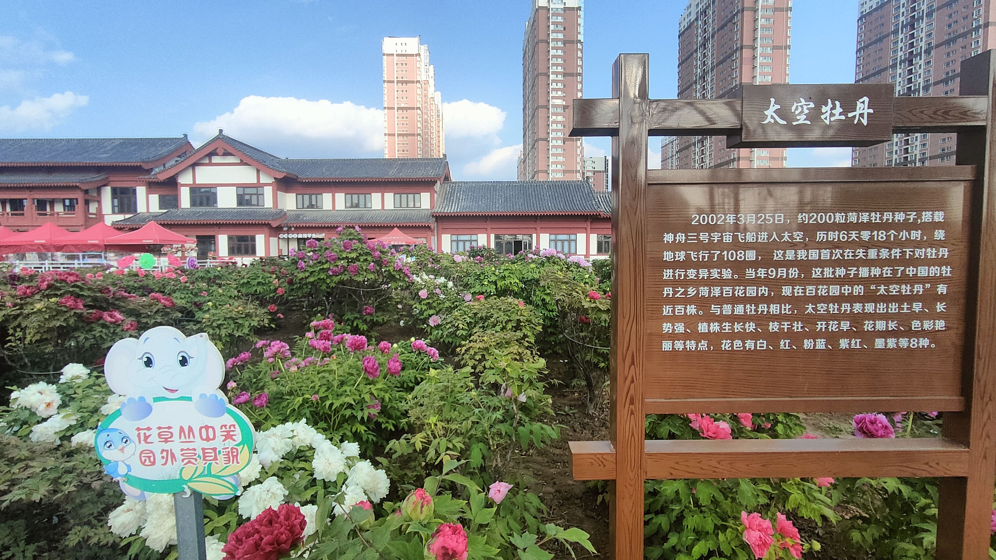 在太空牡丹種植區(qū)樹立著一塊木牌,上面記載著我國首批“太空牡丹”翱翔太空的過程。2002年3月25日,約200粒菏澤牡丹種子,搭載神舟三號宇宙飛船進(jìn)入太空,歷時(shí)6天零18個(gè)小時(shí),繞地球飛行了108圈,這是我國首次在失重條件下對牡丹進(jìn)行變異實(shí)驗(yàn)。當(dāng)年9月份,這批種子播種在了曹州百花園內(nèi)。