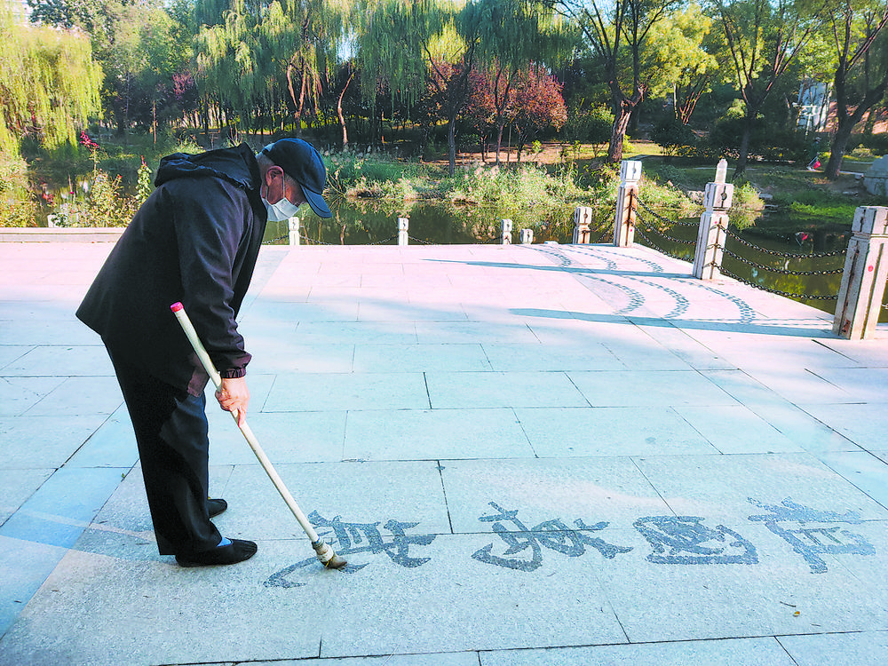 2009年退休后,米長海在研究書法藝術(shù)的同時,又開始習(xí)練地書,清波門廣場成了他的書寫之地。