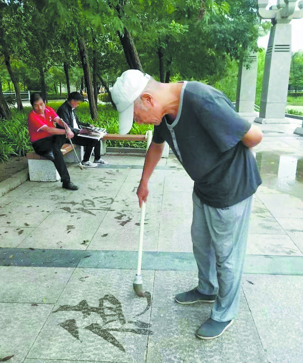 持由海綿制成的專用筆,以水為墨、以地面為紙揮毫“潑墨”,這是近年來流行的地書。