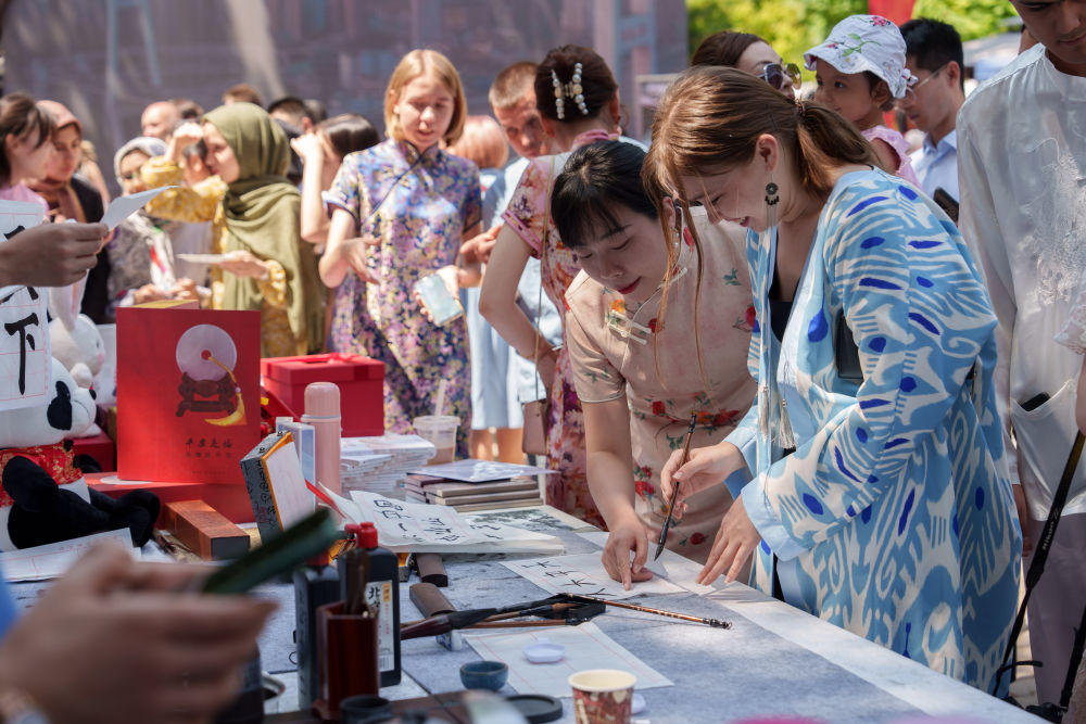 2023年5月27日,人們在烏茲別克斯坦塔什干中央公園舉行的“茶和天下·雅集”活動上體驗中國書法。