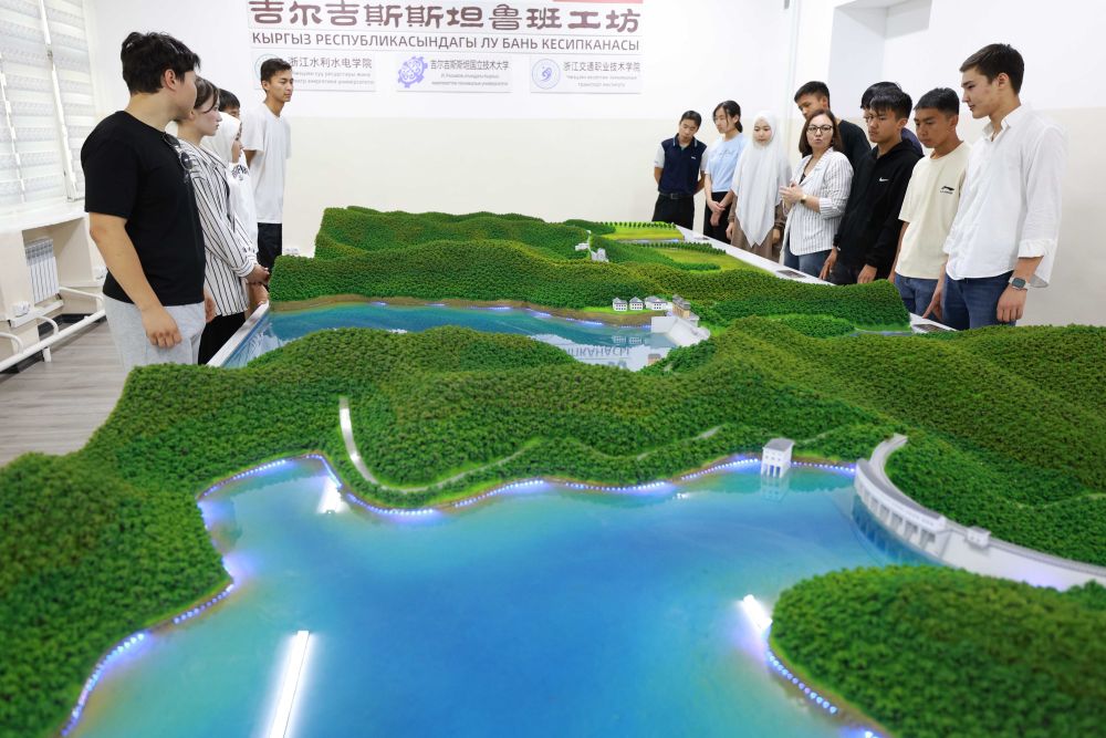2025年6月4日,學(xué)生在吉爾吉斯斯坦首都比什凱克的魯班工坊水利樞紐工程模擬演示實驗室學(xué)習(xí)水電站知識。這家魯班工坊由浙江水利水電學(xué)院與吉爾吉斯斯坦國立技術(shù)大學(xué)等聯(lián)合建設(shè),投入運行半年多來,已有4000多名學(xué)生在這里接受技術(shù)培訓(xùn)。