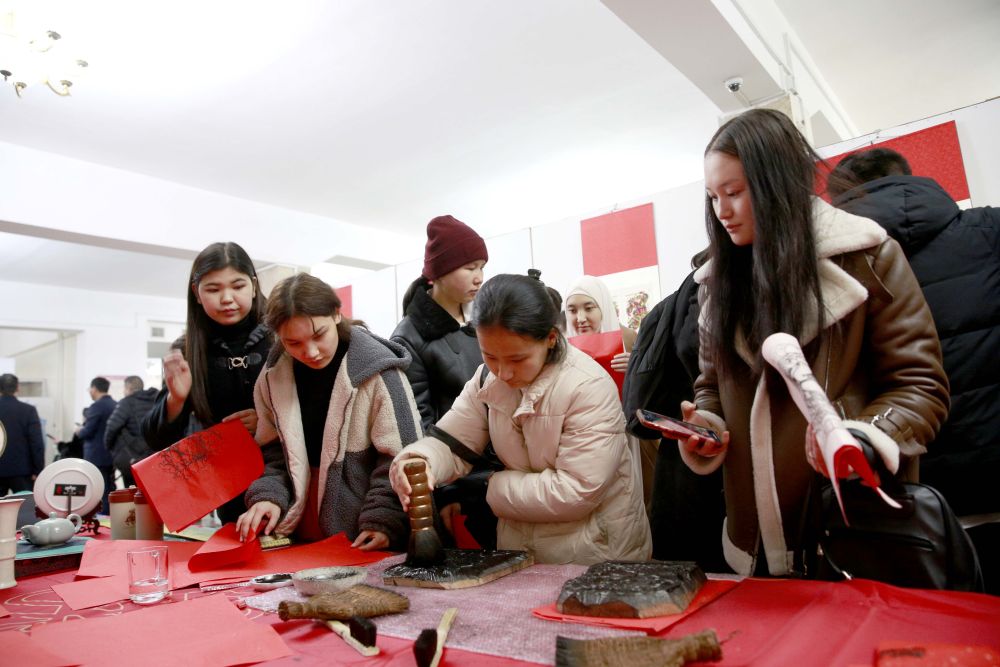 2023年12月26日,人們在吉爾吉斯斯坦比什凱克舉行的“一帶一路”暨中原文化交流展上體驗中國文化。本次展覽主要展出了以“拓傳春秋”為主題的石刻藝術(shù)及以“年畫”為主題的木刻和剪紙藝術(shù)作品。