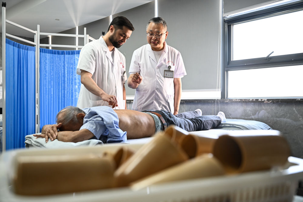 2025年4月18日,在南京中醫(yī)藥大學(xué)第二附屬醫(yī)院針灸康復(fù)科,李小龍(后左)在導(dǎo)師張建斌指導(dǎo)下給患者行針。南京中醫(yī)藥大學(xué)2023級針灸推拿專業(yè)的碩士研究生阿米爾中來自塔吉克斯坦首都杜尚別。中學(xué)時,他愛上了中國文化,給自己取了個中文名字“李小龍”。他刻苦學(xué)習(xí)中文,參加漢語橋中學(xué)生中文比賽,后來多次來到中國,與中醫(yī)結(jié)緣。2015年,李小龍到北京中醫(yī)藥大學(xué)學(xué)習(xí)針灸推拿,畢業(yè)后回到杜尚別開了自己的中醫(yī)診所。2023年,為了進一步提升自己,李小龍來到南京中醫(yī)藥大學(xué)攻讀碩士研究生?!敖窈?,我希望把中醫(yī)帶到更多的國家,讓更多人感受中醫(yī)的妙處?!?/p>