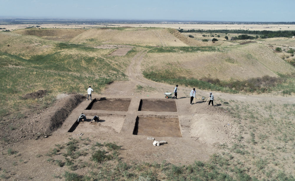 2023年8月9日,考古人員在中哈聯(lián)合考古項目拉哈特遺址探方上工作(無人機照片)。從2017年開始,陜西省考古研究院與哈薩克斯坦伊塞克國家歷史文化博物館組成聯(lián)合考古隊,對拉哈特遺址及附近相關(guān)遺址開展考古調(diào)查與發(fā)掘工作。