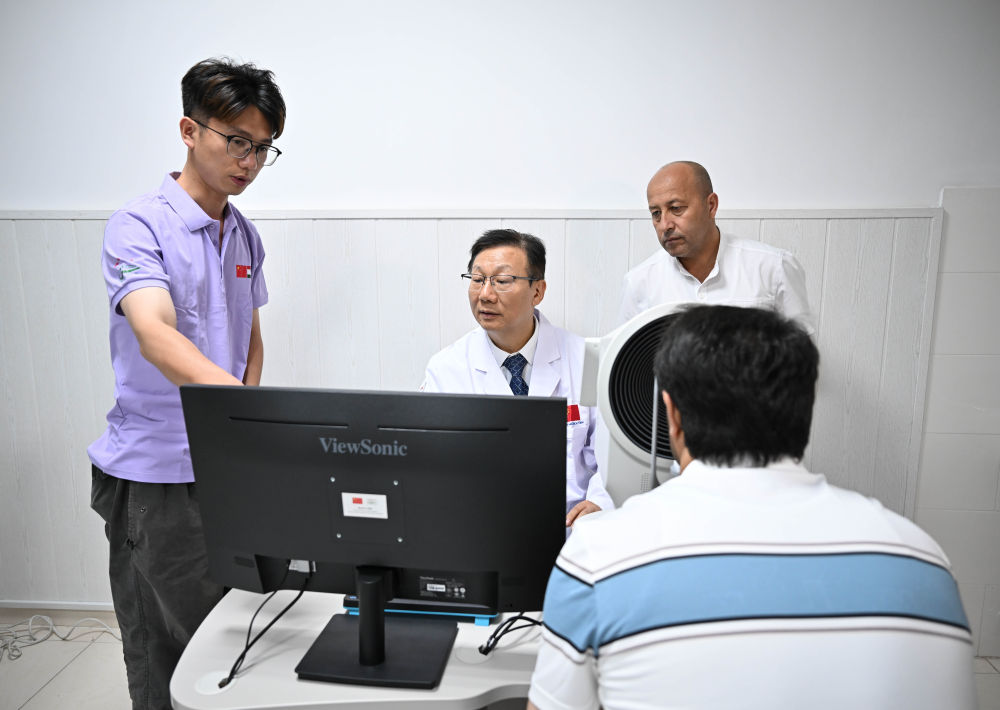 2025年5月31日,在塔吉克斯坦杜尚別,中國眼科專家黨光福(中)在防盲合作中心為當?shù)厥忻褡鲅劭茩z查。當日,“健康快車中塔防盲合作中心”在塔吉克斯坦首都杜尚別開始運營。該中心旨在加強中塔兩國眼科醫(yī)療合作,促進雙方眼科醫(yī)護人員互訪培訓(xùn)和學(xué)術(shù)交流,將惠及更多眼疾患者。