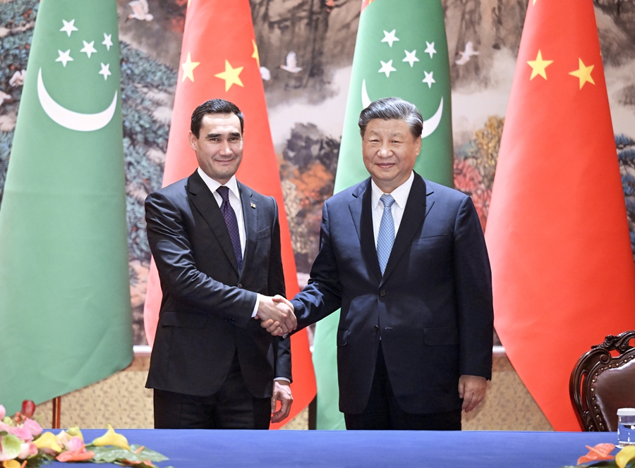 2023年5月18日下午,國家主席習(xí)近平在西安會見來華出席中國-中亞峰會的土庫曼斯坦總統(tǒng)別爾德穆哈梅多夫。會見后,兩國元首共同見證簽署科技、海關(guān)等領(lǐng)域多項雙邊合作文件。新華社記者 謝環(huán)馳 攝