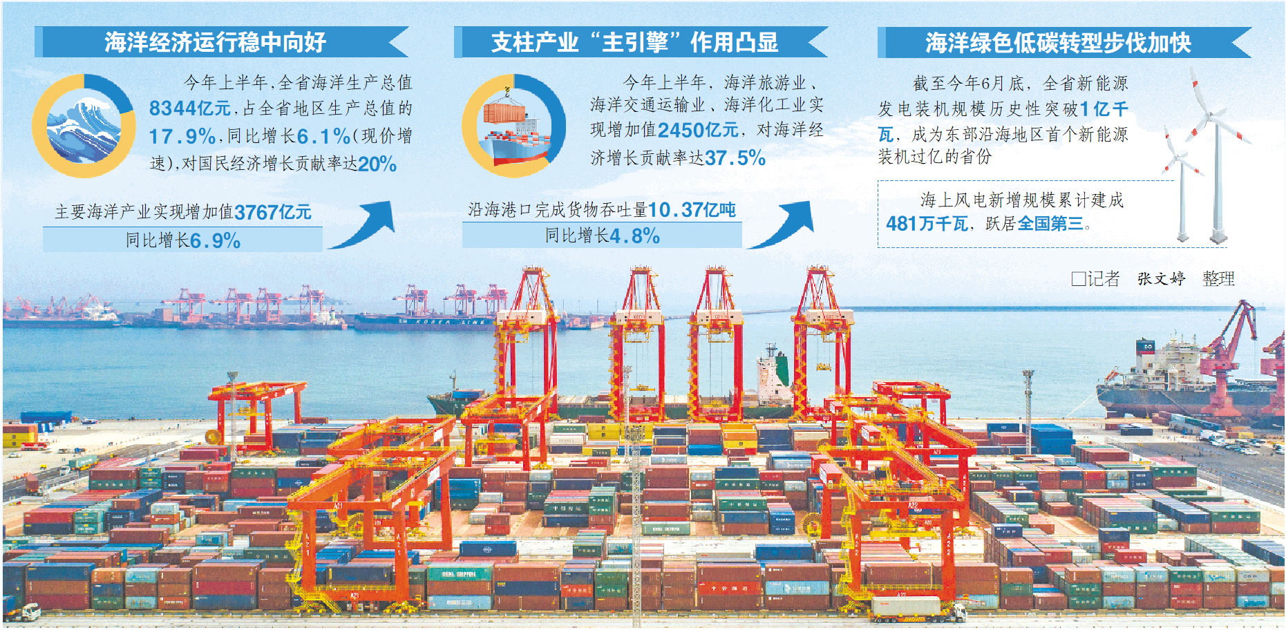 在煙臺長島南隍城海域,一座座大型“海上糧倉”巍然矗立于海天之間。它們是“經(jīng)?!毕盗猩詈V悄芫W(wǎng)箱,也是亞洲最大的量產(chǎn)型深遠海養(yǎng)殖平臺?! 芭c傳統(tǒng)網(wǎng)箱養(yǎng)殖不同,只需操作數(shù)字化系統(tǒng),便可完成養(yǎng)殖任務?!痹谌ツ陝偼度胧褂玫摹敖?jīng)海005號”智能網(wǎng)箱平臺,技術人員王殿超介紹,該網(wǎng)箱深度達到30多米,養(yǎng)殖的海魚能在其中充分游動,獲得類似野生的生長環(huán)境,年產(chǎn)漁獲可達1000噸?! ∪ツ甑祝綎|長島“藍色糧倉”海洋經(jīng)濟開發(fā)區(qū)獲批成立,成為中國首個海上經(jīng)濟開發(fā)區(qū)。擦亮這張新名片,長島正以更大力度深化產(chǎn)業(yè)培育模式變革,“大漁帶小漁”接力養(yǎng)殖便是探索出的新模式之一?!皾O民在近岸海域養(yǎng)殖小魚,等魚長到合適規(guī)格,再由企業(yè)放到深海網(wǎng)箱內(nèi)養(yǎng)殖?!蹦馅虺青l(xiāng)黨委書記、鄉(xiāng)長葛猛說,這種方式使養(yǎng)殖周期縮短1年,漁戶效益增加1倍,實現(xiàn)企業(yè)與漁戶合作雙贏?! ≡谏綎|,以漁業(yè)為代表的傳統(tǒng)海洋產(chǎn)業(yè),在高端化、智能化裝備的加持下走向轉(zhuǎn)型升級之路。與此同時,海洋催生出的一批新興產(chǎn)業(yè)蓬勃發(fā)展,成為推動山東踏浪前行的重要動力源泉?! 〗眨挥谌樯绞心蟼群S虻膰译娡栋雿u南U1場址二期海上風電項目完成全部風機吊裝,向并網(wǎng)發(fā)電邁出關鍵一步?!鞍雿u南U1場址項目投產(chǎn)后每年可為社會提供清潔電能約25.5億千瓦時,節(jié)省標煤消耗約82.9萬噸,減少二氧化碳排放約229.9萬噸?!眹娡叮ㄉ綎|)能源發(fā)展有限公司相關負責人介紹,目前該公司正在積極組織海纜施工和機組調(diào)試,加快各項并網(wǎng)準備工作,確保10月底完成全容量投產(chǎn)?! 〗衲暌詠恚綎|海洋經(jīng)濟運行穩(wěn)中向好、進中提質(zhì),交出一份亮眼成績單。上半年,全省海洋生產(chǎn)總值8344億元,同比增長6.1%;主要海洋產(chǎn)業(yè)實現(xiàn)增加值3767億元,增長6.9%。海洋傳統(tǒng)產(chǎn)業(yè)穩(wěn)中有升,新增國家級海洋牧場示范區(qū)5家,總數(shù)達72家,數(shù)量和規(guī)模均居全國首位。海洋新興產(chǎn)業(yè)加速培育,海洋電力業(yè)、海洋藥物和生物制品業(yè)、海水淡化與綜合利用業(yè)、海洋工程裝備制造業(yè)增加值同比增長7.4%。