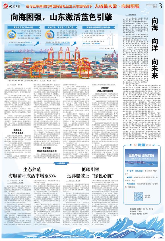 近日,中國船級社質(zhì)量認證有限公司向山東港口渤海灣港集團濰坊港正式頒發(fā)《碳中和評價證書》,標志著濰坊港建成全國首個“零碳港口”?! 拔覀円燥L電、光伏等清潔能源,完成了對傳統(tǒng)火電的替代,目前全港已實現(xiàn)能源綠色‘零碳’排放?!鄙綎|省港口集團濰坊港有限公司總經(jīng)理孫超說,清潔能源不僅為濰坊港每年節(jié)省用電成本約960萬元,而且每年可節(jié)省標煤2.1萬噸、減少二氧化碳排放5.7萬噸。 港口作為基礎性、樞紐性設施,在海洋經(jīng)濟發(fā)展中發(fā)揮著重要的戰(zhàn)略支撐作用。從過去“一群港”到如今“港口群”,經(jīng)過整合,山東海洋港口群已成為我國東西雙向互濟、陸海內(nèi)外聯(lián)動的重要交通樞紐。今年上半年,全省港口新增海運外貿(mào)航線13條,總數(shù)達255條,居我國北方港口首位?! ∫涣鞯母劭陔x不開一流的技術。全球首個“氫+5G”智慧碼頭、全球首創(chuàng)智能空中軌道集疏運系統(tǒng)、全球首創(chuàng)“全系統(tǒng)、全流程、全自動”干散貨專業(yè)化碼頭控制技術、全國首個液化油品智腦生產(chǎn)管控系統(tǒng)……一批全球、全國首創(chuàng)在山東港口誕生,推動港口越來越“聰明”,綜合效能大幅提升?! 母劭谝挥绶叛酆Q蟀l(fā)展全景,山東持續(xù)深化海洋科技創(chuàng)新,推進高水平海洋科技自立自強。2021年—2023年,海洋科技資金投入達36.5億元;約有50家“國字號”海洋科研機構集聚山東;??招畔⒏兄c處理技術、極地深海信息感知與智能探測、深海裝備智聯(lián)網(wǎng)等省重點實驗室獲批建設;擁有20多位全職住魯海洋界院士,約占全國的三分之一?! 罢娼鸢足y”的投入換來海洋科技創(chuàng)新成果競相涌現(xiàn)。今年以來,“深海一號超深水大氣田開發(fā)工程關鍵技術與應用”項目獲國家科學技術進步獎一等獎;青島藍色種業(yè)研究院攻關三文魚國產(chǎn)化繁育,成功實現(xiàn)誘導“偽雄魚”,突破人工繁育“卡脖子”難題;中船發(fā)動機公司成功交驗國內(nèi)首臺甲醇雙燃料低速機……海洋科技優(yōu)勢正轉(zhuǎn)化為經(jīng)略海洋的山東實踐。
