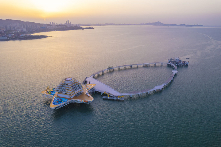 從煙臺市萊山區(qū)漁人碼頭海域俯瞰,“耕海1號”如同一顆璀璨的“項(xiàng)鏈”,鑲嵌在蔚藍(lán)的大海上,閃耀著創(chuàng)新與活力的光芒。