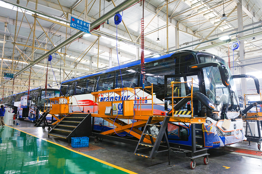 中通客車新能源客車生產(chǎn)車間,工作人員正在調(diào)試新能源客車